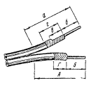 При восстановлении поливинилхлоридной оболочки сваркой медными вкладышами перед соединением жил на один конец кабеля надевают поливинилхлоридную трубку. После восстановления экрана трубку надвигают на сросток и располагают так, чтобы она перекрывала прилегающие участки оболочки на одинаковую длину. С одного конца сростка под трубку вставляют два медных вкладыша. Конец трубки с вкладышами обматывают резиновой лентой шириной 10 - 15 мм. Хвостовые части вкладышей попеременно нагревают паяльной лампой. После нагрева введенных в муфту участков вкладышей до температуры + 180 ÷ 200 °C они самопроизвольно выдавливаются и выпадают. Муфту охлаждают 2 - 3 мин в неподвижном состоянии, после чего разматывают и снимают резиновую ленту. Второй конец муфты сваривают с оболочкой аналогичным способом.