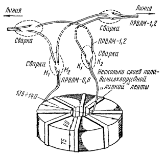Каждая из соединенных жил плотно обматывается поливинилхлоридной лентой с таким расчетом, чтобы общая толщина сростка была больше на 0,5 - 0,8 мм толщины провода с оболочкой.