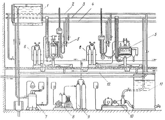 Фильтрационно-суффозионный лоток (рис. 28), чаще всего используемый для испытаний грунта на контактный размыв, состоит из рабочей камеры в виде открытой сверху прямоугольной коробки, к торцевым решетчатым стенкам которой присоединены: с одной стороны - фор-камера, куда подают воду, а с другой - отстойник с водосливом. Одну из боковых стенок камеры обычно делают прозрачной, чтобы можно было наблюдать, как происходит размыв грунта. На противоположной боковой стенке имеются отверстия с присоединенными к ним (через трехходовые краники) пьезометрами.