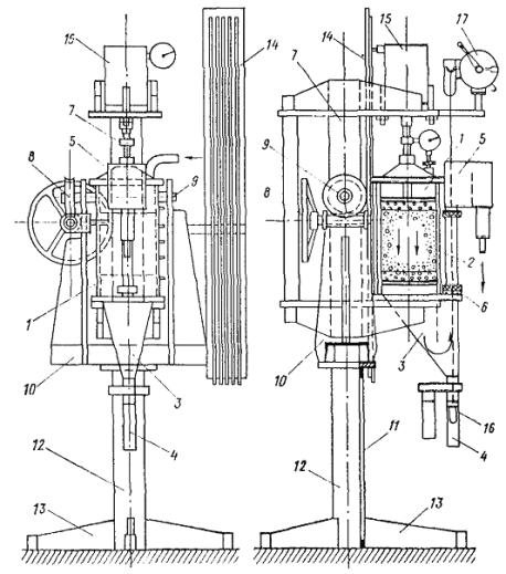 1 - корпус; 2 - центральная перфорированная трубка; 3 - поршень; 4 - испытываемый грунт; 5 - штуцеры с отверстиями (фильеры); 6 - регулировочный кран; 7 - манометр; 8 - распределительная сетка; 9 - дренажная сетка; 10 - дренажные отверстия; 11 - кювет для сбора воды; 12 - сливная трубка; 13 - индикатор осадки грунта; 14 - выдвижная подставка для индикатора; 15 - пробка