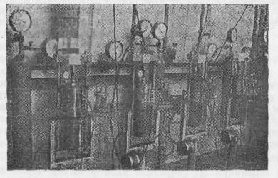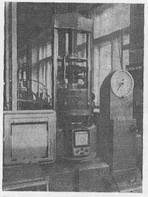 Один из таких приборов с рабочей камерой диаметром 31 см и высотой 26 см показан на фотографии (рис. 27). Вертикальная сжимающая нагрузка, постоянно передаваемая поршнем на грунт, может достигать в этом приборе 250 H/см2.