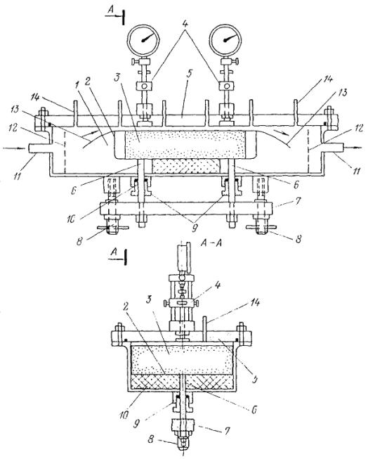 Для равномерного притока воды (жидкости) к грунту трубка 2 снаружи окружена металлической сеткой 8 галунного плетения. Дренирование фильтрационного потока осуществляется такой же сеткой 9, расположенной на внутренней поверхности корпуса, в котором для лучшего оттока воды имеются дренажные отверстия 10. Профильтровавшаяся вода вытекает через эти отверстия и собирается в кювете 11, откуда она по сливной трубке 12 поступает в мерный сосуд. Суммарную осадку грунта определяют по показаниям трех симметрично расположенных на поршне индикаторов 13, причем опорой для их штоков служат выдвижные подставки 14, закрепленные на корпусе прибора. Эти подставки позволяют легко устанавливать начальные нулевые показания индикаторов.