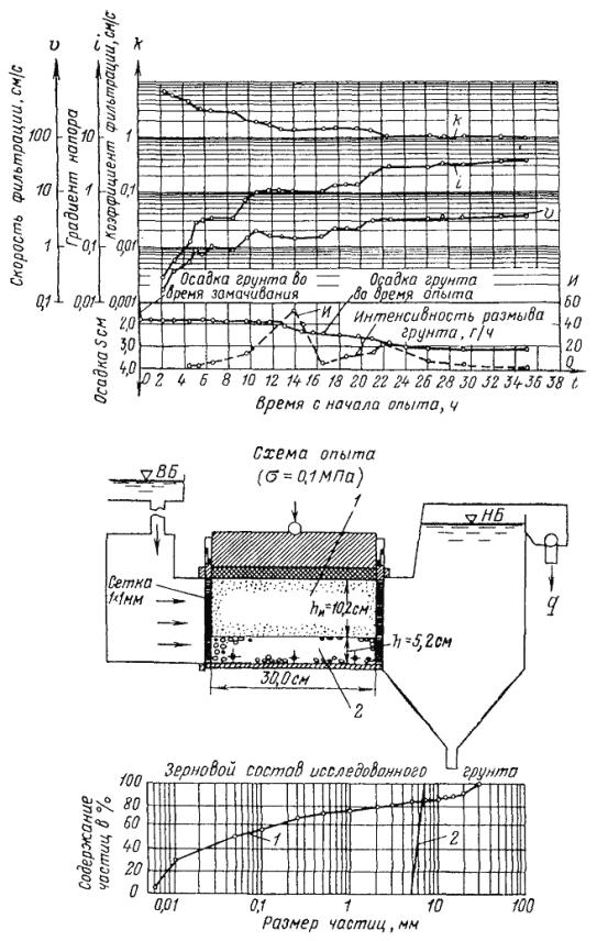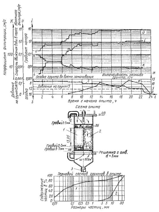 Рис. 30. Схема и результаты испытаний грунта на контактный размыв в вертикальном фильтрационно-суффозионном приборе