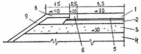 1 - покрытие; 2 - основание; 3 - нижний слой основания; 4 - земляное полотно; 5 - выравнивающий слой; 6 - краевая укрепительная полоса; 7 - укрепленная часть обочины; 8 - неукрепленная часть обочины; 9 - откос