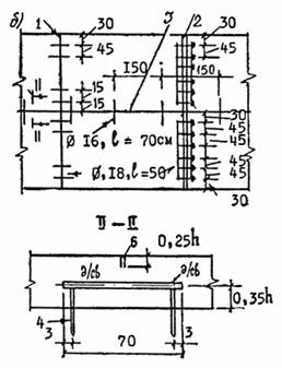 Бетонные полосы разделяют поперечными швами, которые должны быть продолжением швов в покрытии. При устройстве бетонных покрытий со шпунтами на боковых гранях и при отсутствии штырей в поперечных швах бетонных покрытий в швах краевых полос ставят штыри - по одному - два стержня длиной 50 см и диаметром 16 - 18 мм по типу штырей в швах сжатия и расширения в покрытии (с обмазкой и с колпачками в швах расширения).