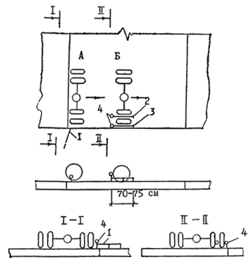 Рис. П. 5.1. Расположение колесной нагрузки трехточечных прогибомеров (1, 2 и, как вариант, 3) - при определении эквивалентного модуля упругости основания (А), толщины покрытия (Б); индикатор прогибомера (4); направление съезда автомобиля с точки испытания