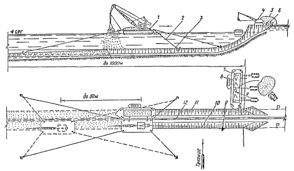 2. На несудоходных реках траншеи в руслах рек разрабатываются легкими и средними земснарядами с глубиной осадки до 1,5 м. В зимнее время легкие земснаряды типа ПМТ-100 могут работать со льда.