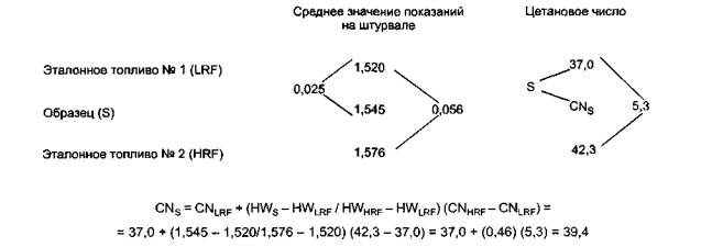 Цетановое число дизельного топлива определяется путем сравнения характеристик его сгорания в двигателе с характеристиками сгорания смесей эталонных топлив с известными цетановыми числами в стандартных рабочих условиях испытания. Это сравнение проводится по отсчетам, полученным на маховичке, для образца и двух используемых эталонных топлив с цетановыми числами большим и меньшим, чем у образца (процедура «взятия в вилку»), путем изменения степени сжатия для получения требуемого угла задержки воспламенения, что позволяет провести интерполяцию цетанового числа в единицах отсчета по маховичку устройства изменения степени сжатия.