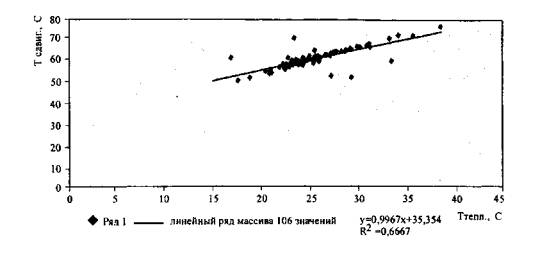 Тсдвиг = 0,9967 Ттепл + 35,354, R2 = 0,6667.