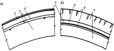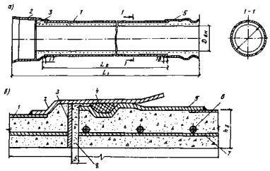 С целью повышения несущей способности и долговечности труб с остальным цилиндром была разработана новая усовершенствованная конструкция - труба напорная самонапряженная со стальным цилиндром* (схемы напорных труб со стальным цилиндром той и другой конструкции приведены на рис. 6).