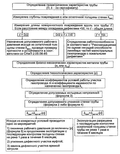 Для определения работоспособности участков газопроводов с поверхностными повреждениями рекомендуется применять следующий алгоритм (рис.3).