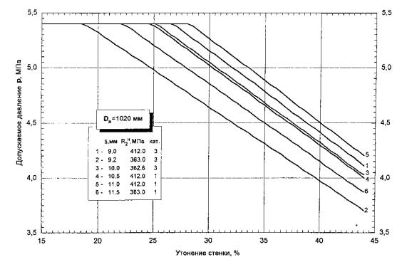 Рис. 3 Зависимость допускаемого давления от утонения стенки трубы для участка газопровода диаметром 1020 мм.