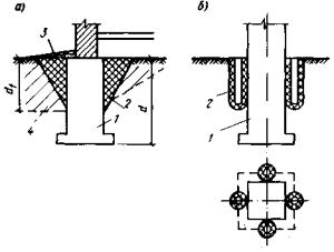 устройством в незаселенных грунтах у фундамента шпуров (рис. 18, б), набиваемых кристаллической солью и в дальнейшем заливаемых насыщенным раствором той же соли.