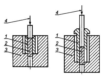 Образец устанавливают на подставку, закрепленную на прессе, и выдавливают износостойкий элемент из корпуса согласно рисунку А.3.