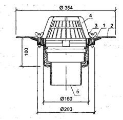 1 - прижимной фланец; 2 - чаша (опорный элемент) воронки; 3 - битумно-полимерное полотно; 4 - листвоуловитель (HL 062.1Е); 5 - выпуск воронки HL 62H