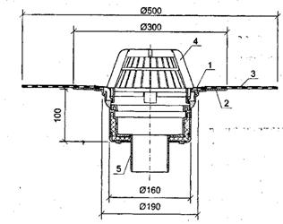 4.13. Вокруг воронки для стилобата предусматривают укладку бетона, армированного сеткой из конструкционной стали для обеспечения устойчивости (жёсткости) её верхней части, а остальные участки могут быть выполнены также из бетона или асфальта, тротуарных плиток и т.п. (рис. 15). Высота воронки в зависимости от толщины слоев покрытия обеспечивается доборными (надставными) элементами, а водонепроницаемость примыкания к воронке водоизоляционного ковра - зажимным фланцем или приклейкой к битумно-полимерному фланцу.