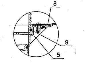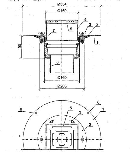 1 - опорный элемент (чаша) воронки; 2 - прижимной фланец (HL 062. 3Е); 3 - накидные гайки (HL 062.4E); 4 - надставной элемент из полипропилена (HL 062B.2E); 5 - решётка из нержавеющей стали (HL 062В. 1Е); 6 - выпуск воронки HL 62В; 7 - дренажное кольцо (HL 062В.3Е); 8 - отверстия для крепления воронки к несущей конструкции