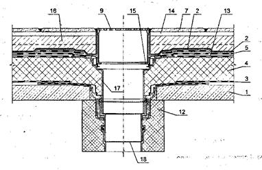 1 - несущая плита; 2 - геотекстиль; 3 - пароизоляция; 4 - теплоизоляция; 5 - водоизоляционный ковёр; 6 - гравий; 7 - плитка; 8 - дренажное кольцо HL 160; 9 - трап воронки HL 62B (HL 62BH); 10- надставной элемент HL 65; 11 - корпус воронки HL 62B; 12-утепление воронки от выпадения конденсата; 13 – дополнительный водоизоляционный ковер (усиление ендовы); 14 - цементно-песчаный раствор; 15 - дренажное кольцо воронки; 16 - слой бетона; 17 - надставной элемент HL 65H; 18 - корпус воронки HL 62BH