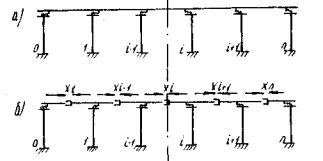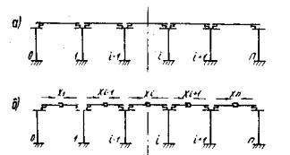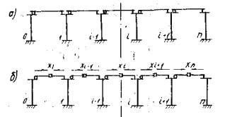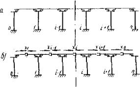 2.4. Для путепровода с разрезными пролетными строениями, опирающимися одним концом через шарнирно-неподвижные, а другим через шарнирно-подвижные опорные части, продольные усилия Xi и значение х0 определяют решением статически неопределимой рамы (рис. 2).