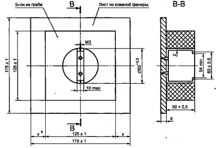 Образцы устанавливают на фанере в нормальном эксплуатационном положении. Если невозможно установить образцы прямо на фанеру, то в НД на изделие должно быть предусмотрено соответствующее крепление. Например, крепление для внутренних выключателей показано на рисунке Г.4, а крепление для патрона лампы - на рисунке Г.5.