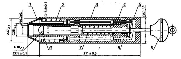 На рисунке Д. 1 приведен пример испытательного пружинного ударного устройства, соответствующего требованиям раздела 5, для энергии удара не более 1 Дж. Масса корпуса - (1250 ± 10) г. Головка ударника прикреплена к его стержню таким образом, чтобы расстояние от ее кончика до плоскости удара в момент, когда ударник находится во взведенном состоянии, имело приблизительное значение, приведенное для сжатой пружины в таблице Д. 1.