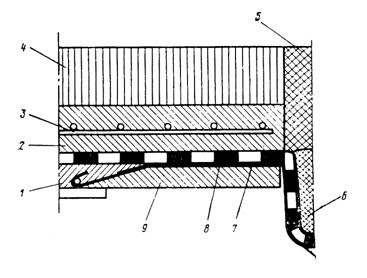 В этой связи более эффективными являются специальные механизмы-укладчики утяжеленных рулонных материалов, в которых процесс расплава битума воздушно-пропановыми горелками совмещен с раскаткой и приклейкой рулонного материала и укаткой гидроизоляционного покрытия до полной его готовности. На рис. 2 приведена схема укладчика ЦНИИС, в котором на самодвижущейся платформе 1 с электродвигателем, имеющим рулевое 5 и рычажное 4 управление, агрегатированы многофакельная линейная горелка ГВПЛ 7, баллон с пропаном 3, электрозажигалки 2, питатель рулонного материала 6, прикатывающий 8 и уплотняющий 9 дифференциальные катки.