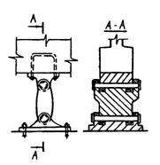 Подвижные опорные части могут потерять устойчивость также при сильных вертикальных сейсмических толчках, когда сила тяжести преодолевается и опорные узлы отделяются от опоры. Чтобы ограничить приподнимание опорных узлов и предотвратить потерю пролетным строением опорных частей, применяют анкерное устройство (рис. 17), состоящее из заведенной под ригель анкерной балки и вертикальных стержней, закрепленных гайками на упорных уголках, прикрепленных к главным балкам пролетного строения. Вертикальные стержни и их крепление рассчитаны на восприятие силы, равной 10 % опорной реакции балки от веса пролетного строения.