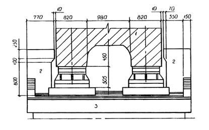 Демпферы одноосного действия типа «изгибаемая пластина» установлены на трехпролетном путепроводе. Пролетное строение неразрезное, общей длиной 52 м, из предварительно-напряженного железобетона. Демпферы, поставленные на подферменных площадках промежуточных опор, действуют в поперечном (к оси моста) направлении, а размещенные на устоях - в продольном. Конструкция демпфера обеспечивает свободу температурных деформаций пролетного строения. Расчетная сейсмическая нагрузка принята такой же, как в обычном варианте, но надежность сооружения увеличилась за счет лучшего рассеяния энергии колебаний. В проекте многопролетного неразрезного моста длиной 264 м с коробчатым пролетным строением из предварительно-напряженного железобетона предусмотрены демпферы одноосного действия типа «изгибаемый стержень». Опорные части пролетного строения плоские, из полимерного материала. Демпферы, установленные на подферменных площадках устоев и промежуточных опор, поглощают энергию колебаний пролетного строения в поперечном к оси моста направлении. На устое размещен демпфер, поглощающий энергию колебаний пролетного строения вдоль оси моста. Комбинированная система гашения колебаний использована на трехпролетном мосту с разрезными сталежелезобетонными пролетными строениями длиной по 25 м. Гасители колебаний выполнены в виде заглубленных в насыпь плит и резинометаллических опорных частей, имеющих свинцовый сердечник (рис. 19). Такие опорные части снижают сейсмическую нагрузку, практически не препятствуя температурным перемещениям верхнего строения.