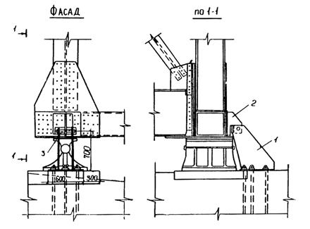 Во время сильного землетрясения срезанный каток опорной части может опрокинуться. Для повышения устойчивости катка амплитуда сейсмических колебаний опорного узла сталежелезобетонного пролетного строения длиной 27 м относительно устоя ограничивается упорами и стопорами (рис. 16). Упоры выполняют из уголков, прикрепленных в горизонтальном положении четырьмя болтами к нижнему поясу каждой балки пролетного строения. Стопоры запроектированы в виде двутавровых балок, усиленных ребрами жесткости и притянутых гайками к передней грани устоя. Удерживается стопор двумя металлическими анкерами, заделанными в бетон на глубину 70 см. Расстояние между упором и стопором достаточно для свободного перемещения опорного узла при изменениях температуры и землетрясениях умеренной силы.