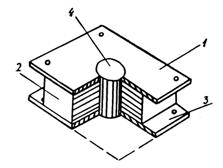 1 - пластина, прикрепляемая к пролетному строению; 2 - резиновая прокладка: 3 – пластина, прикрепляемая к опоре; 4 - свинцовый сердечник