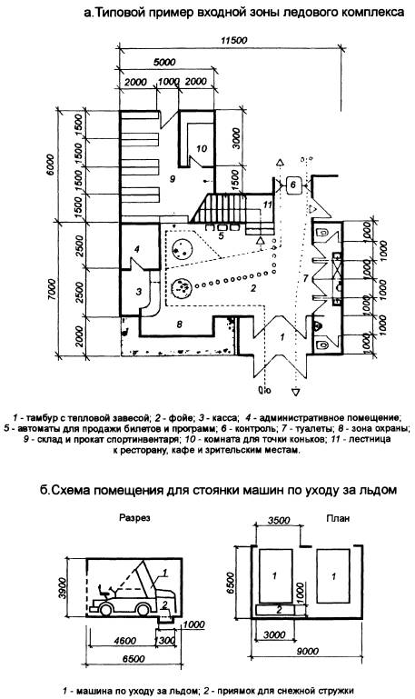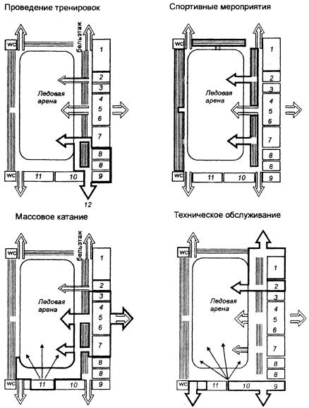 1 - техническое помещение; 2 - гараж; 3 - туалет; 4 - кассы; 5 - фойе; 6 - сервисная зона, прокат коньков, 7 - помещение для катающихся; 8 - помещения для команд; 9 - помещение обслуживания, 10 - администрация; 11 - кафе-бар; 12 - парковка автобусов.