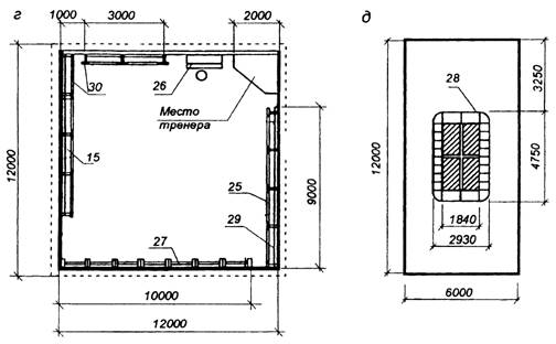 г - планировочная схема помещения для групповых занятий ритмической гимнастикой, хореографией и женской оздоровительной гимнастикой; д - помещение для акробатической подготовки спортсменов