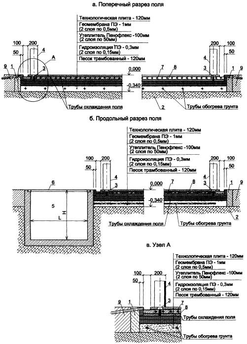 2 - грунт; 3 - закладная деталь борта; 4 - хоккейный борт; 5 - канал для отвода