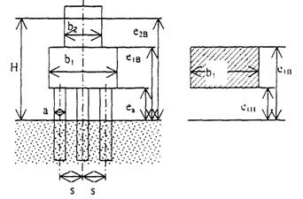 Рис. 2.3. Схема к определению расчетной ширины опоры на высоком свайном ростверке с числом свай в ряду N = 3 (справа выделен первый элемент)