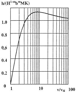 Табулированные значения относительной глубины размыва h/(H1-m·bm·M·К) в зависимости от относительной скорости потока воды V/VН приведены в приложении П. 3.