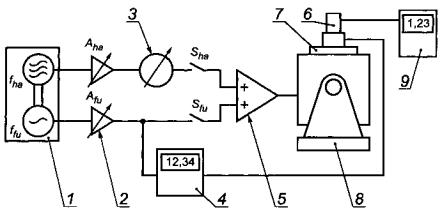 1 - генератор двухканального сигнала с контролируемым сдвигом фаз; 2 - усилитель с регулируемым коэффициентом усиления; 3 - фазовращатель; 4 - фазометр; 5 - сумматор с усилителем мощности; 6 - датчик вибрации испытуемого средства измерений; 7 - эталонный акселерометр; 8 - вибростенд; 9 - измерительный блок испытуемого средства измерений