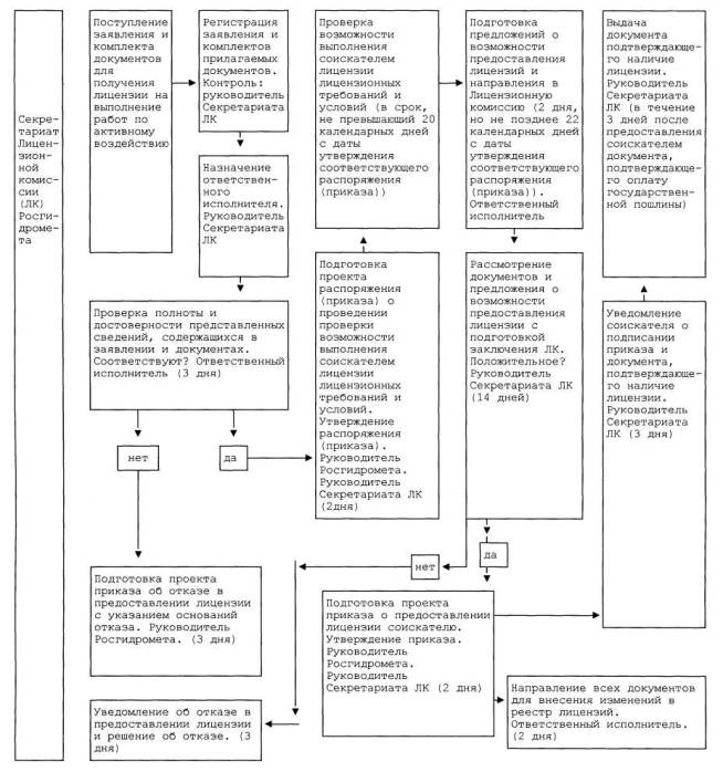 1) рассмотрение заявления и принятие решения о предоставлении лицензии на выполнение работ по активному воздействию (приложение 1). Основание - статья 9 Федерального закона от 08.08.2001 N 128-ФЗ в редакции Федерального закона от 2 июля 2005 г. N 80-ФЗ;