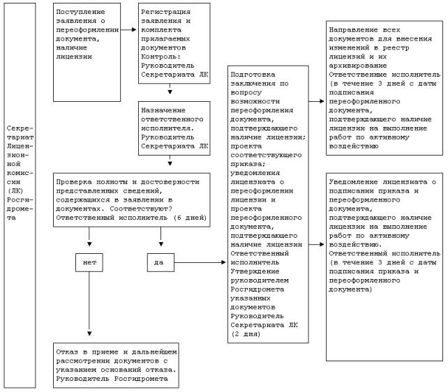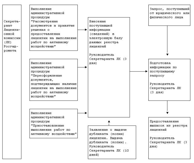 3.3. Административная процедура "Рассмотрение документов и принятие решения о предоставлении лицензии на выполнение работ по активному воздействию на гидрометеорологические процессы и явления" осуществляется в связи с поступлением заявления и документов от юридического лица в соответствии с нижеследующим порядком (схема осуществления административной процедуры приведена в приложении 1).