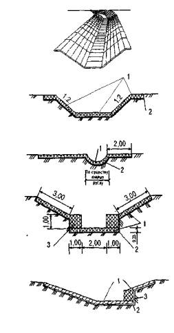 Рис. 39. Схемы возможных габионных укреплений водоотводных канав, резервов и кюветов: