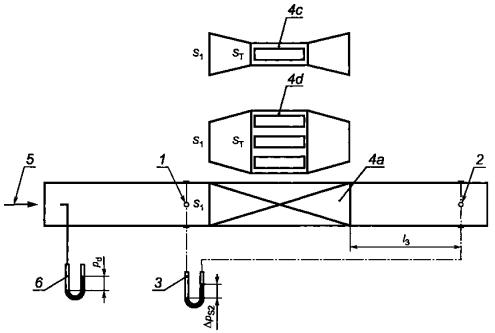 В соответствии с настоящим стандартом подлежат определению потери полного давления глушителя, используемого с потоком. Поэтому испытательный стенд оборудуется измерительными средствами и приборами для определения потерь полного давления.