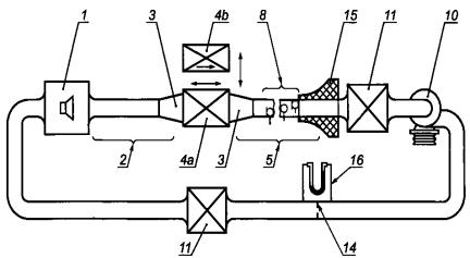 1 - модуль громкоговорителя в камере источника; 2 - испытательный воздуховод перед испытуемым объектом; 3 - переходные элементы; 4а - испытуемый объект; 4b - замещающий воздуховод; 5 - испытательный воздуховод за испытуемым объектом; 6 - передающий элемент, используемый также как диффузор потока; 7 - реверберационное помещение; 8 - защищенный от потока микрофон (как альтернатива 9); 9 - положения микрофона в реверберационном помещении (как альтернатива 8); 10 - вентилятор (устанавливается для создания прямого и обратного потока относительно направления распространения звука); 11 - глушители вентилятора; 12 - эластичные секции воздуховода; 13 - виброизоляция; 14 - сопло для измерения расхода (альтернативы: диафрагма или насадка Вентури); 15 - концевое поглощающее устройство; 16 - измеритель статического давления