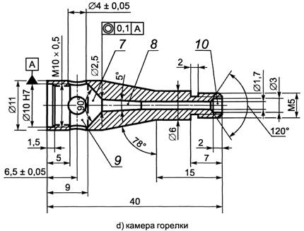7 - зона смешения газа; 8 - зона диффузии; 9 - воздушная камера; 10 - выходное отверстие Рисунок 2 - Газовая горелка, лист 2