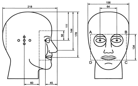 Примечание - Требования к контрольному макету головы и основные размеры - по ГОСТ Р 12.4.013.230.2(приложение А).