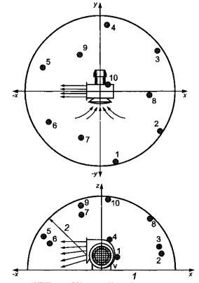 Измерительная поверхность является полусферой, центр которой расположен на пересечении оси симметрии каждого входа и плоскости, перпендикулярной к этой оси. Полусфера расположена выше по течению потока относительно входа (см. рисунки 5 и 6).