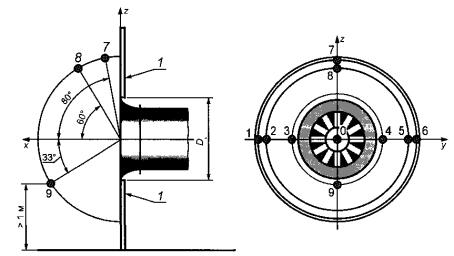 Используют ту же полусферическую измерительную поверхность радиуса r, что применяется для определения уровней звукового давления (см. рисунок А.1). Вертикальный звукоотражающий экран устанавливают перед входом вентилятора, а образцовый источник шума вблизи оси вентилятора. Размеры экрана должны превосходить радиус измерительной поверхности более чем на