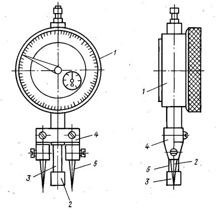 1- индикатор часового типа; 2 - измерительный стержень индикатора; 3 - наконечник измерительного стержня; 4 - иглодержатель; 5 - иглы