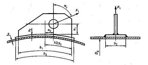 е1 - расстояние между точкой приложения усилия и обечайкой или подкладным листом, мм;