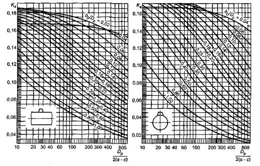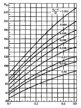 9.4.4 Коэффициенты К20 и К21 определяют по графикам, приведенным на рисунках 13 и 14 соответственно, в зависимости от относительной толщины днища (s1 - с) / D и относительной длины линии контакта опоры с днищем l / D.