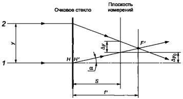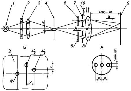 Рисунок 1 - Принципиальная оптическая схема для испытания на сферическую рефракцию и астигматизм очковых и покровных стекол без корригирующего эффекта