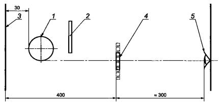 5.1.1.4 Позади тест-объекта помещают источник излучения. В качестве источника излучения применяют источники излучения типа А, например, лампы накаливания, цветовая температура нити Тц которых должна составлять (2856 ± 50)°К.